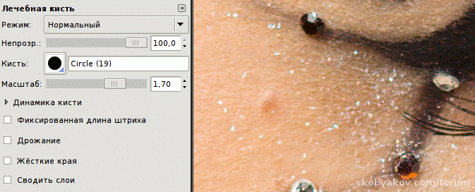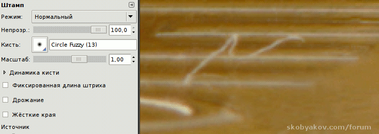 Не хочу в который раз повторять принцип действия инструментов — об этом лучше всего почитать у самих разработчиков GIMP'а: Штамп и Лечебная кисть.